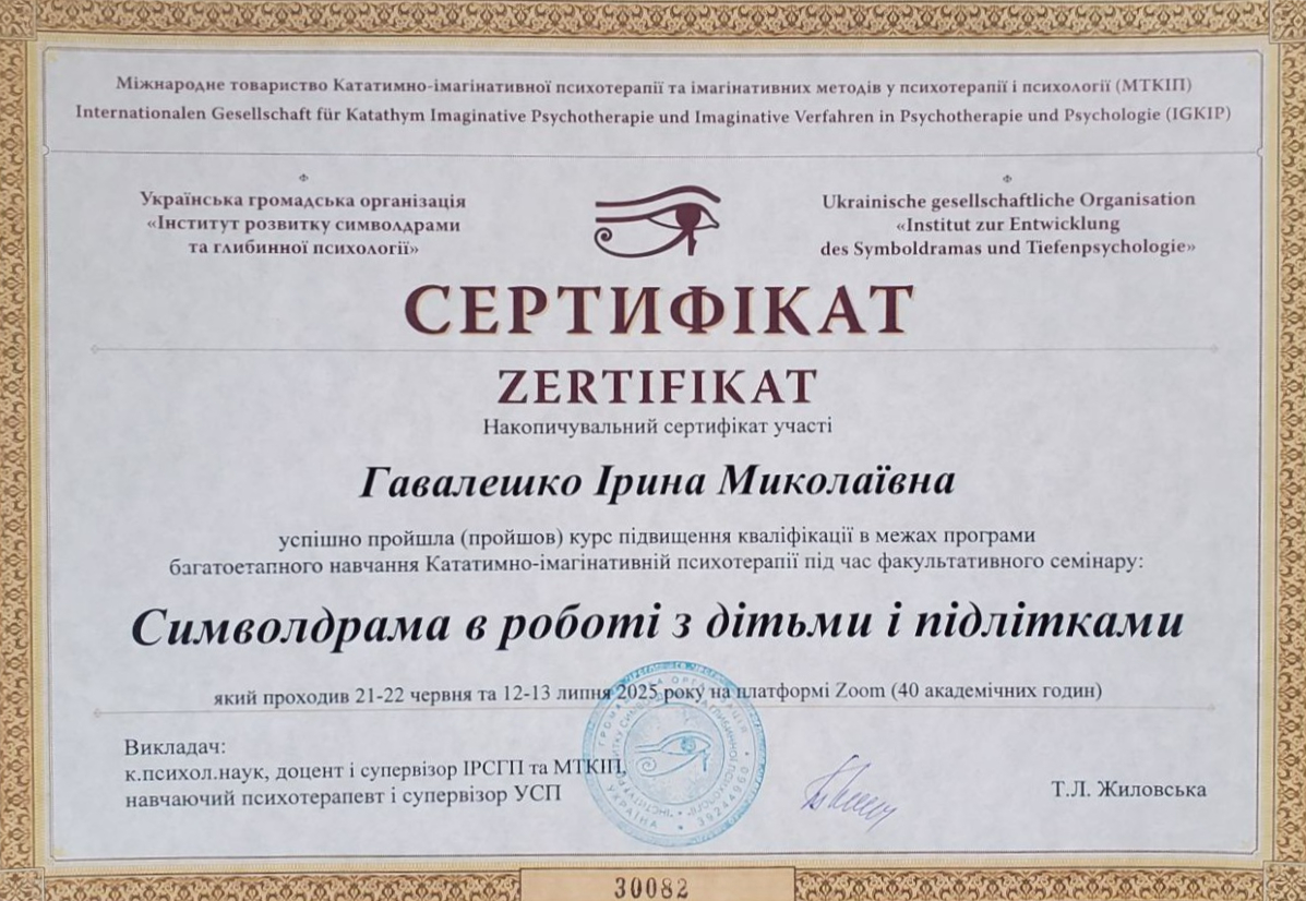кататимно-імагінативна психотерапія (символдрама). Це глибинний і турботливий психотерапевтичний метод, який поєднує психоаналіз і працю з уявою, фантазією, зі снами, образами і символами. Переконалася в його ефективності і як пацієнтка, і як терапевтка.